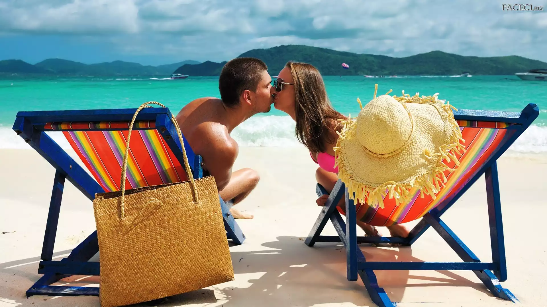 Morze, Kobieta, Kapelusz, Miłość, Plaża, Leżaki, Lato, Mężczyzna, Wakacje, Torba, Pocałunek - faceci.biz |