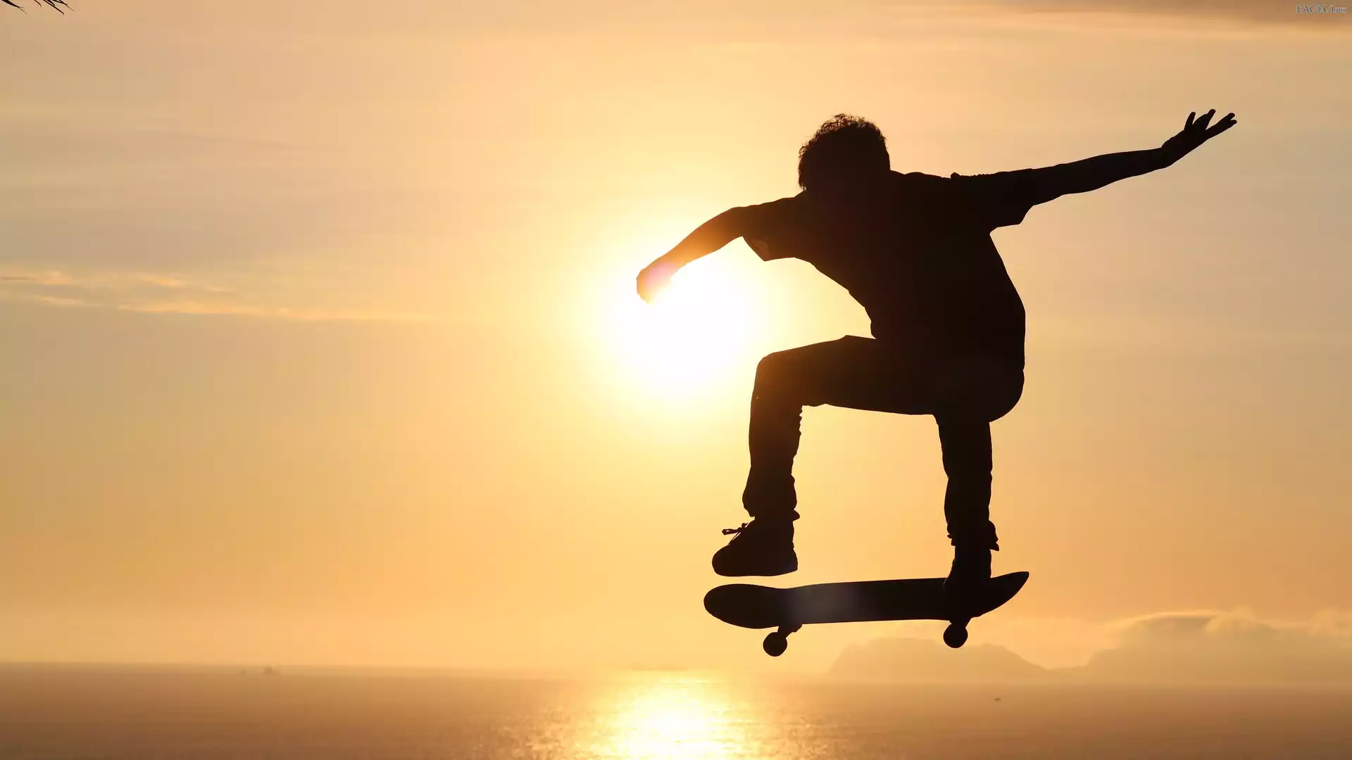 Mężczyzna, Zachód słońca, Deskorolka, Sylwetka - faceci.biz